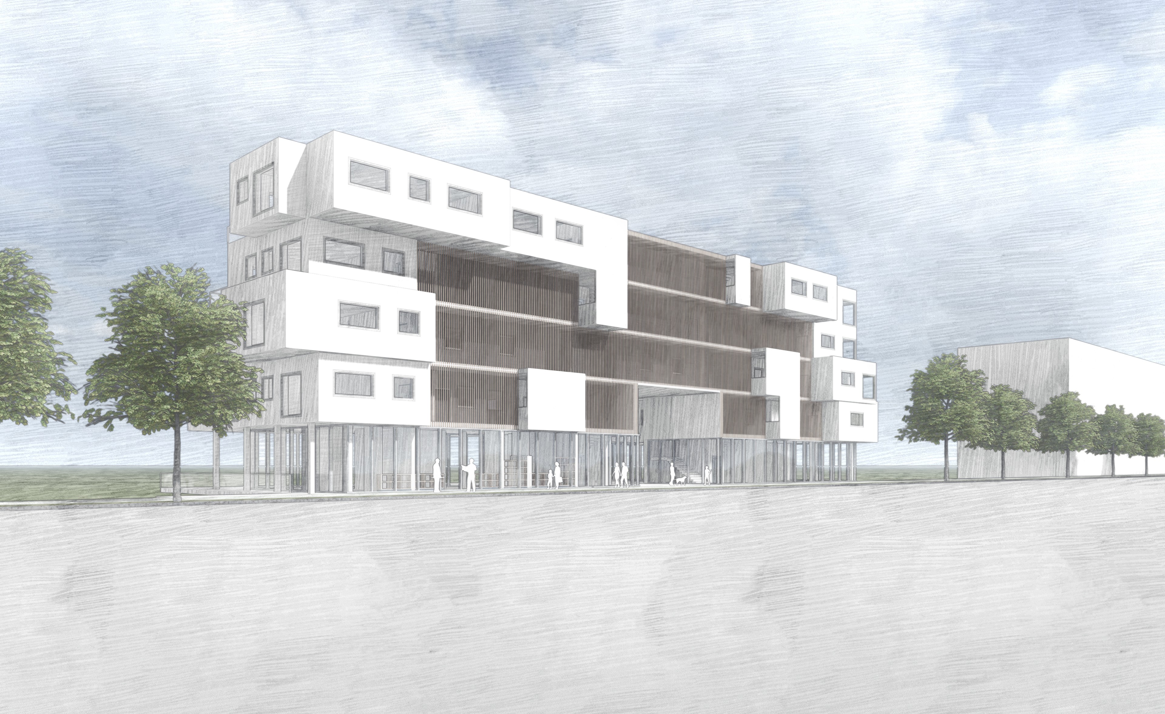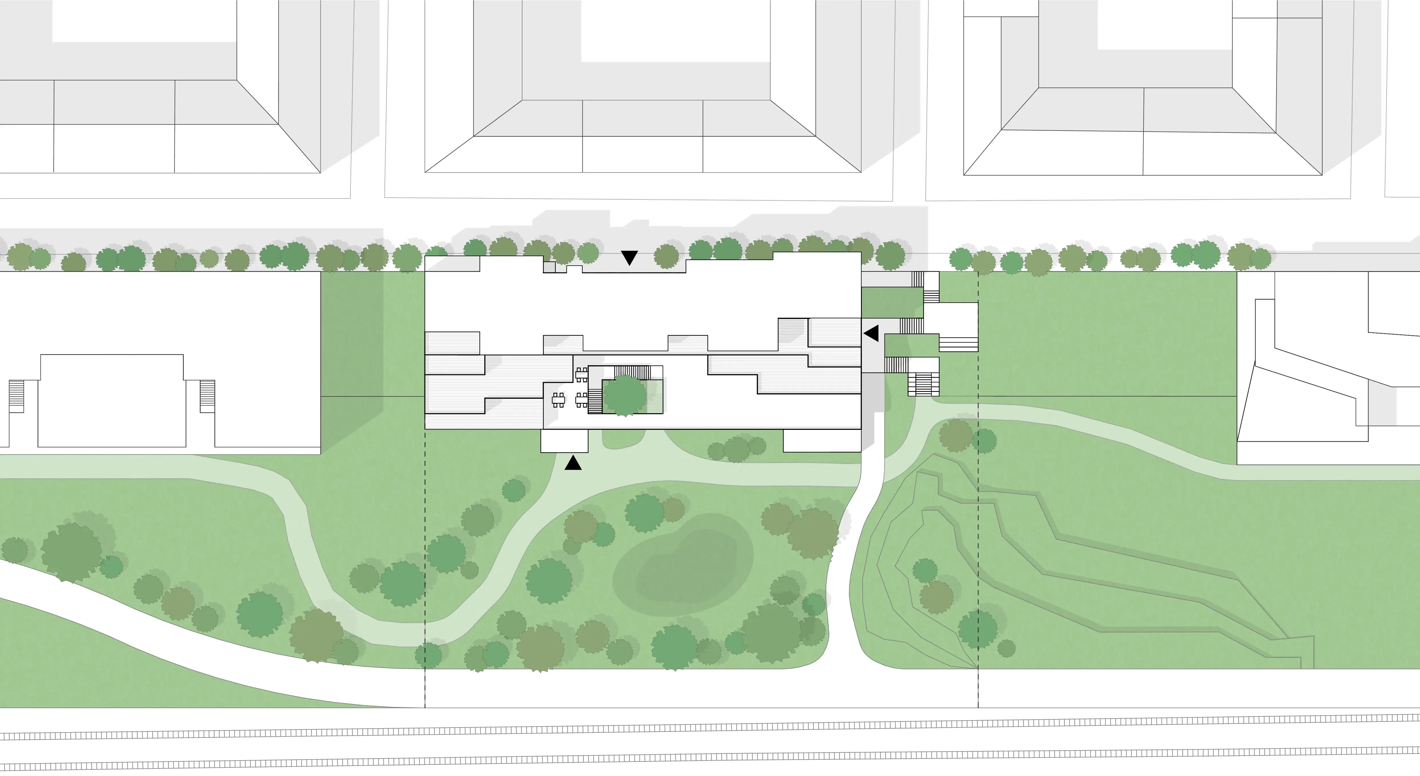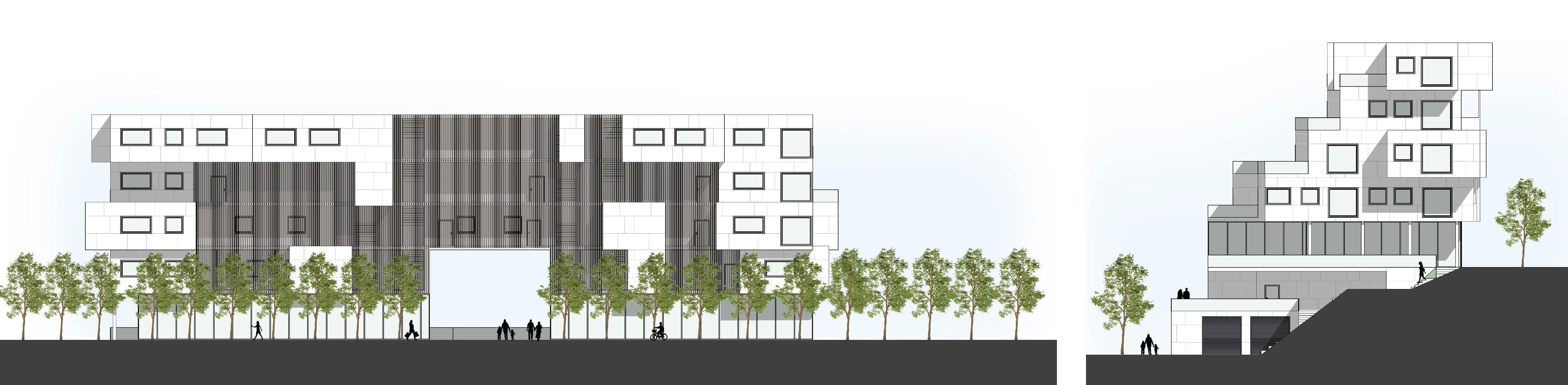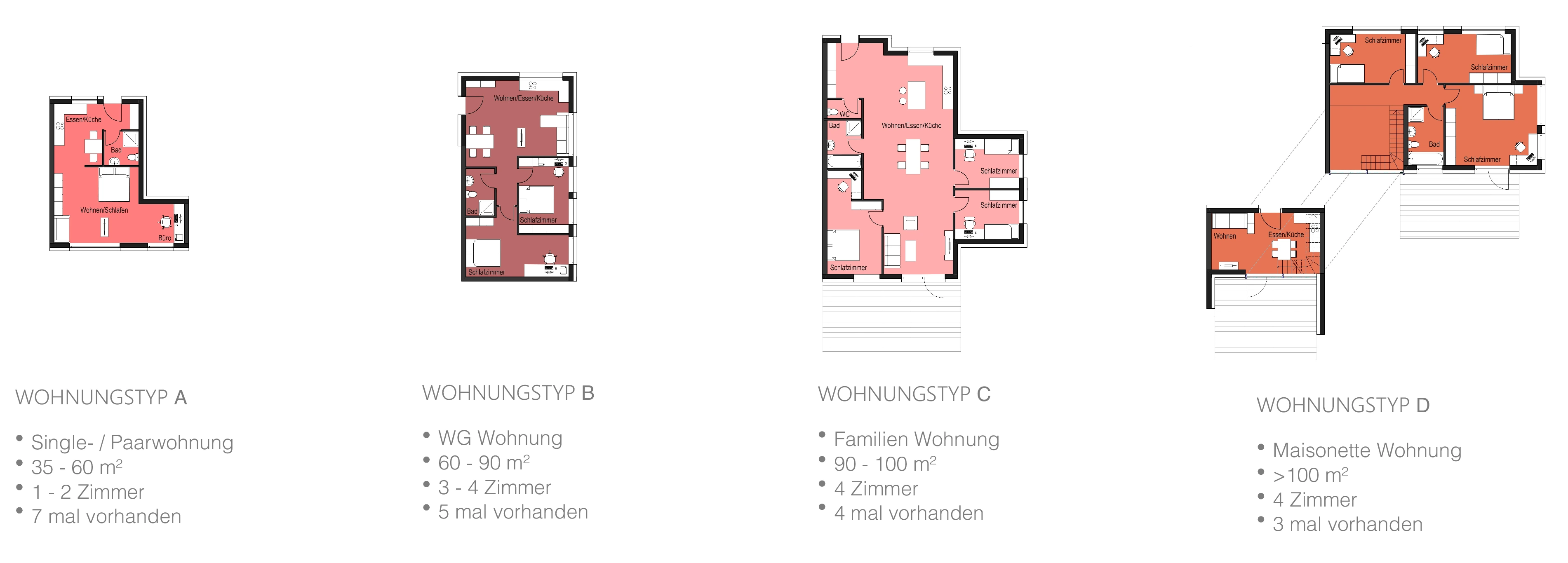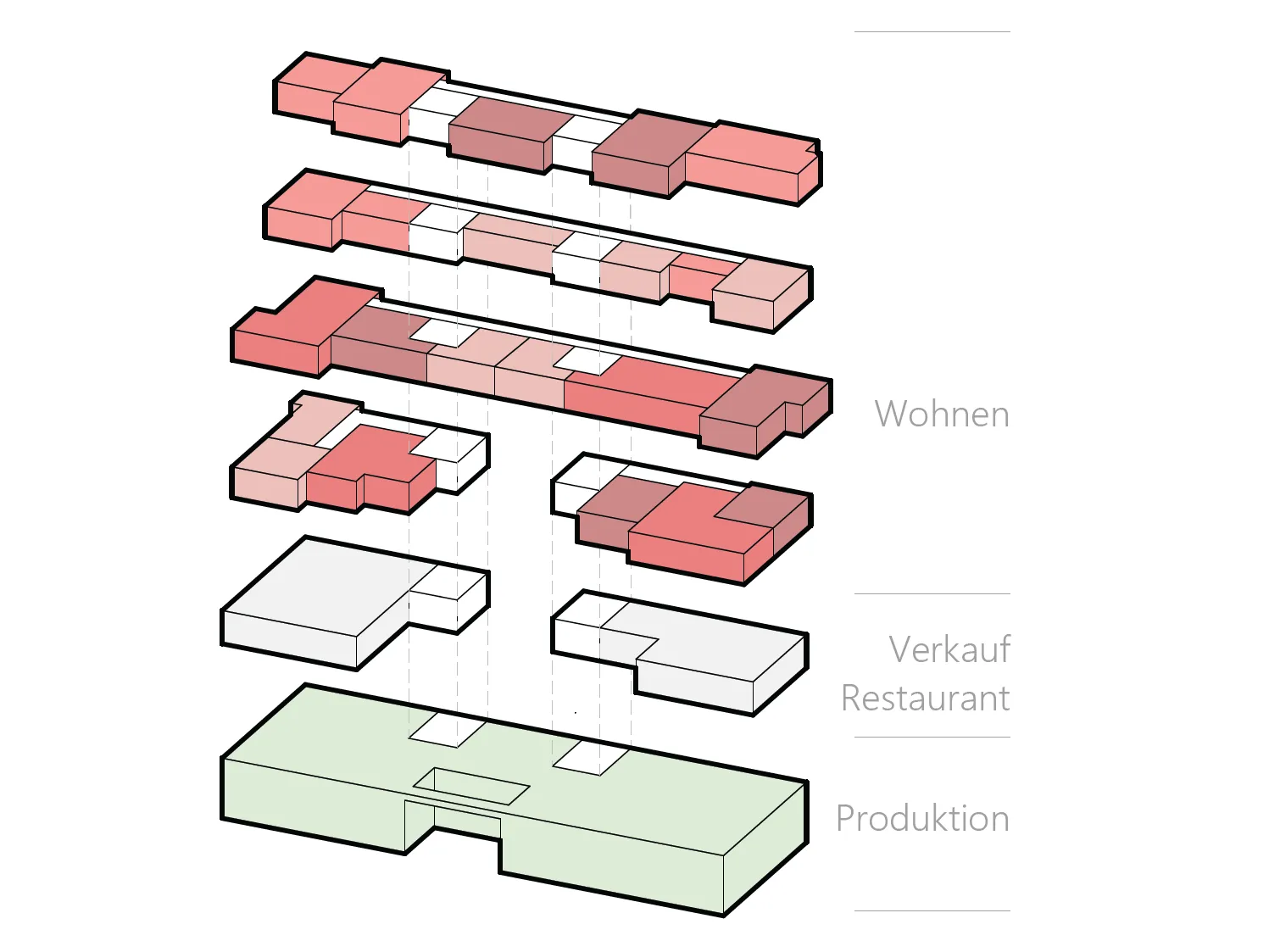 Das Projekt kombiniert verschiedene Wohnungstypen, die gemeinsam die Grundform bestimmen. An der Straßenseite wurde bewusst mit der bestehenden Blockstruktur gespielt und ein Laubengang angeordnet. Richtung Park öffnet sich das Wohngebäude, um den neu entstandenen Freiraum harmonisch in den Park einzubinden. Vertikal ist das Gebäude so strukturiert, dass sich auf Gleisniveau eine Werkstatt befindet, die direkt mit dem Verkaufsraum auf Straßenniveau verbunden ist. Darüber erstreckt sich der gemischte Wohnbereich.
